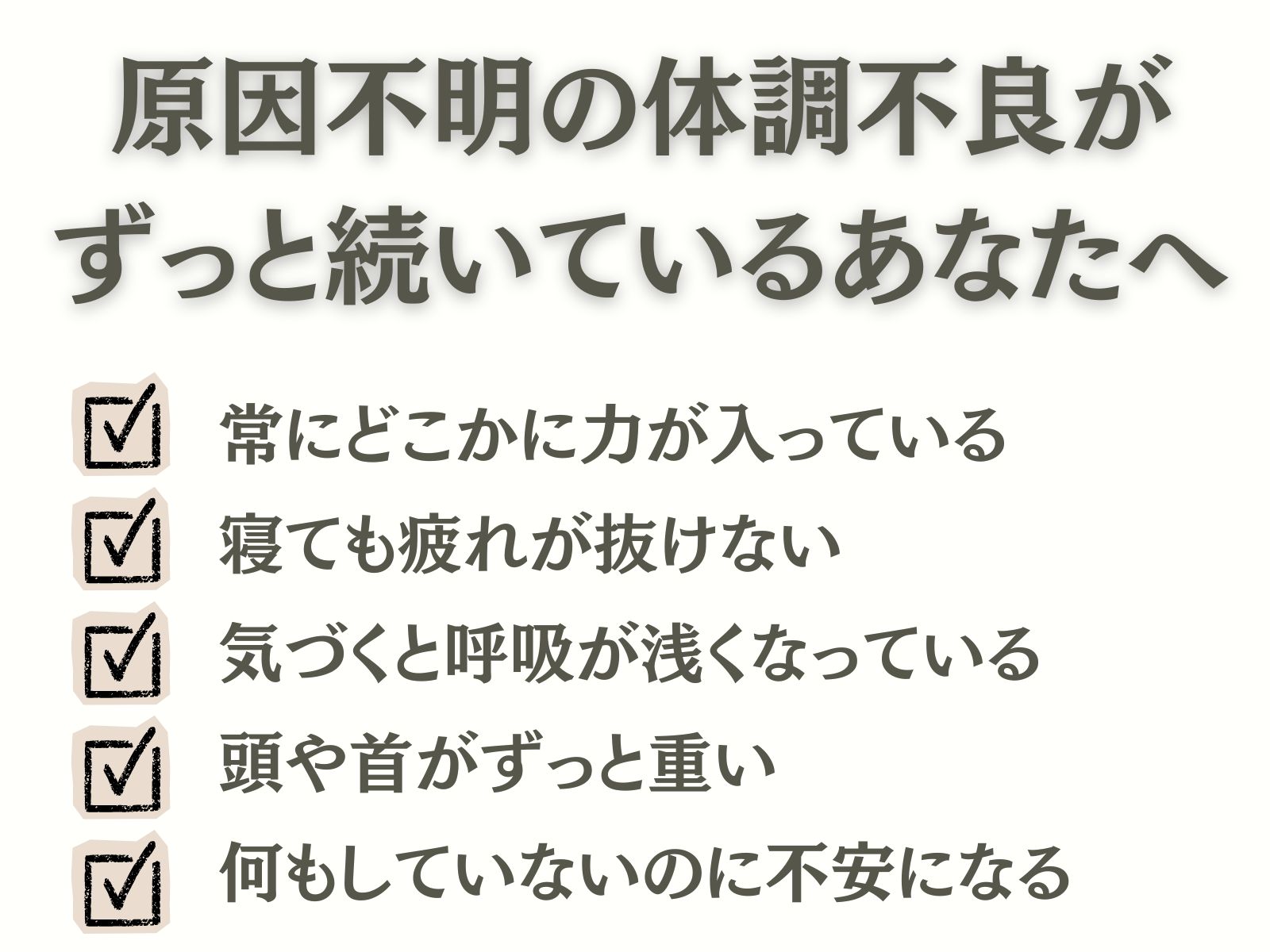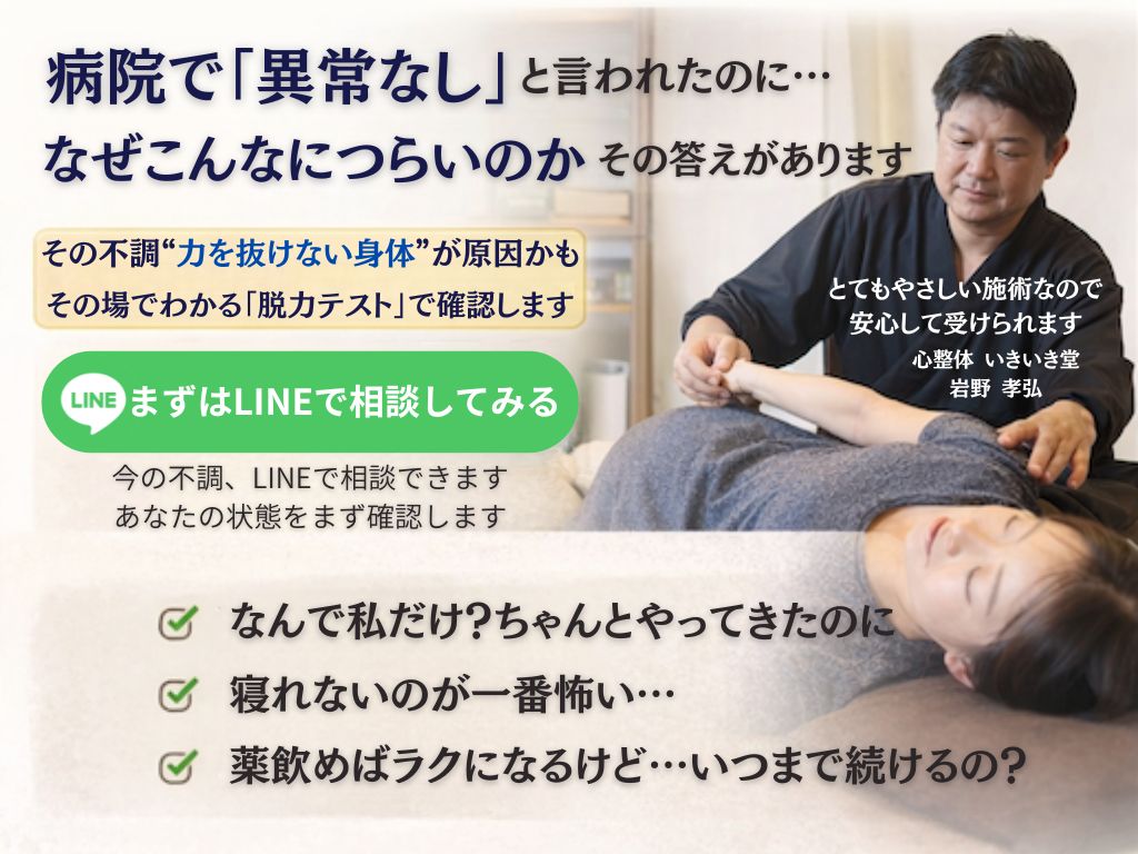 慢性頭痛・めまい・自律神経不調・動悸・呼吸が浅い・不安・パニック・うつなど、病院では「異常なし」と言われたけど、どうにもならない…慢性不調の改善を目指します。