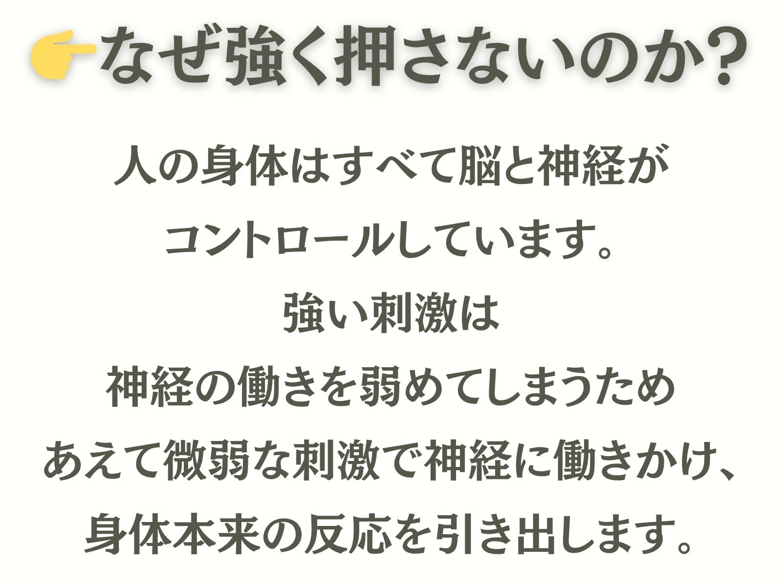 当院は一時的なほぐしやリラクゼーションではなく、自律神経と身体の使い方や脳の使い方を整え、不調の根本改善をめざしています。