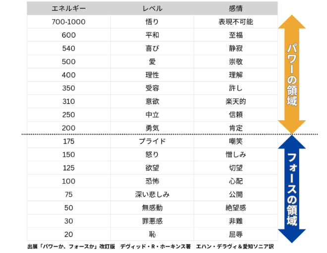 この表は、人の意識状態を17段階に分けたもの。下位のレベルには恐怖・怒り・プライド・無関心などが並び、これをホーキンズ博士は「フォース(Force)の領域」と呼びました。